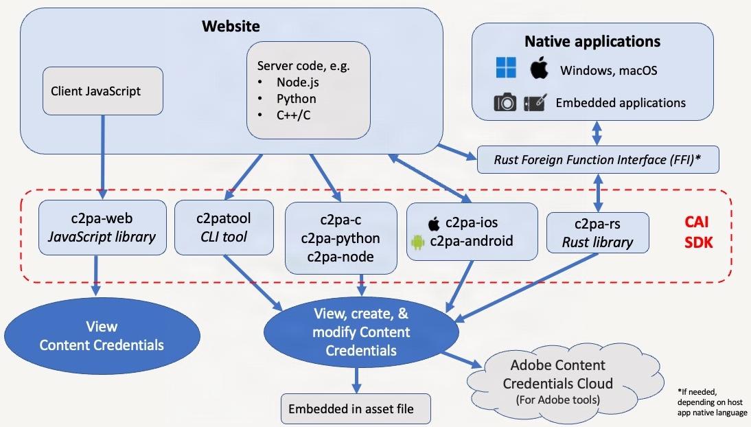 - C/C++, Python, Node.js libraries that enable applications to read and validate manifest data, create and sign manifest data, and embed it supported asset files.